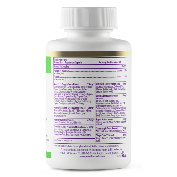 Paradise Earth’s Blend Vitamin D3 + K2 is truly a Nature Synergized superfood. Our formula uses real whole-food goodness paired with vitamin D3 & K2, probiotics and mood lifting adaptogens to go beyond mere deficiencies and help support overall whole system health. *
